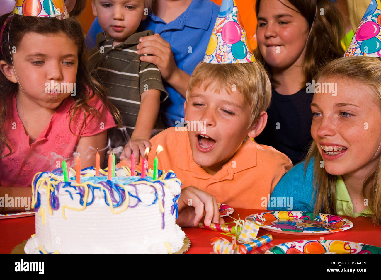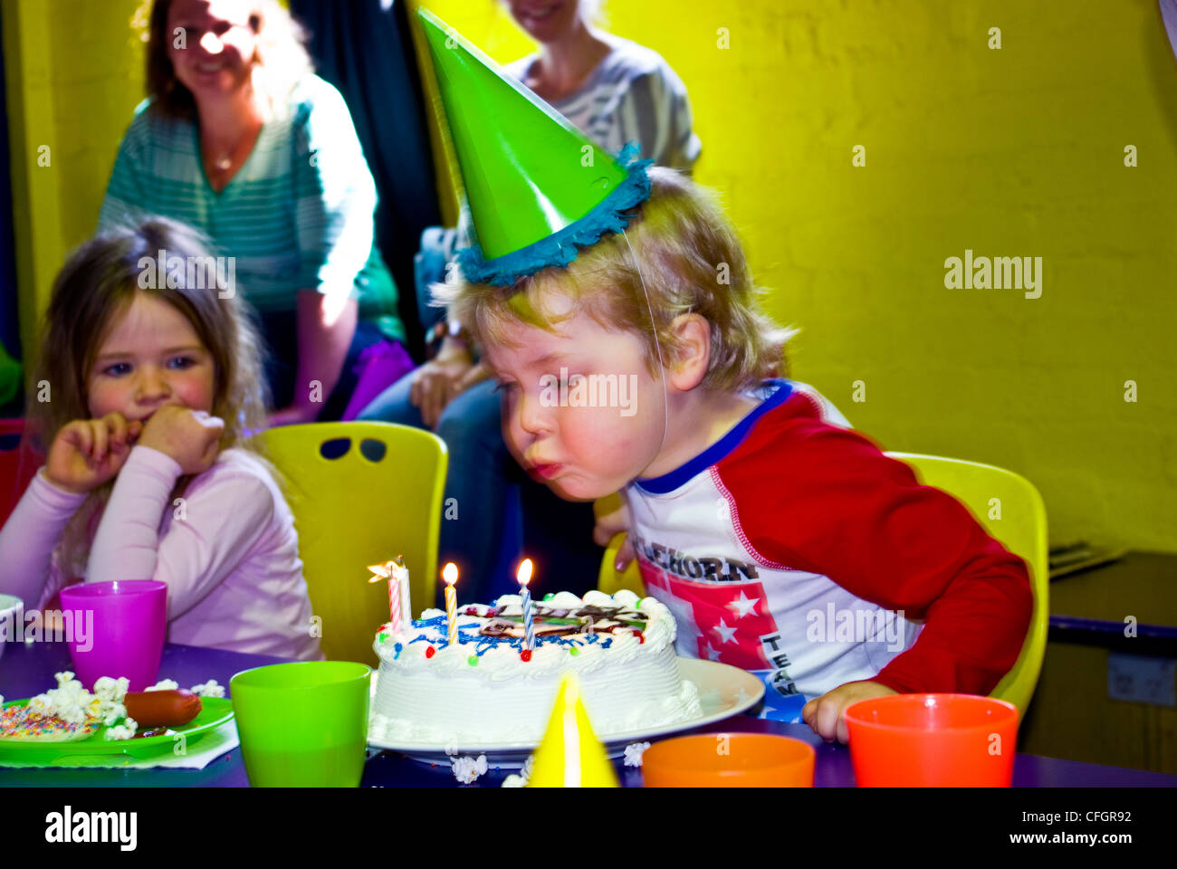 Boy Making A Wish And Blowing Out Candles At Birthday Party Stock